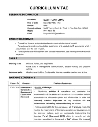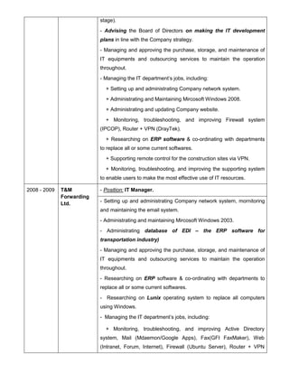 The document is a curriculum vitae that provides personal and professional details of an IT professional. Over the past 10 years, the professional has worked in various IT manager roles developing policies and procedures, managing IT projects, advising on IT development plans, and overseeing the purchase and maintenance of IT equipment. Their skills include management, communication, problem-solving and proficiency in English. They have several technical certifications and an master's degree in computer science.