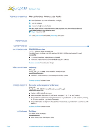 Manuel Américo Ribeiro Alves Rocha is a Portuguese computer systems designer and analyst seeking a preferred job. He has over 10 years of experience in roles such as a PLM consultant, intern, computer programmer, payment system developer, and publisher. Rocha obtained a degree in Computer Health and is currently pursuing a Master's in Computer Science with a focus on information and knowledge systems. He has strong skills in programming languages, databases, CMS, eCommerce platforms, and payment systems.