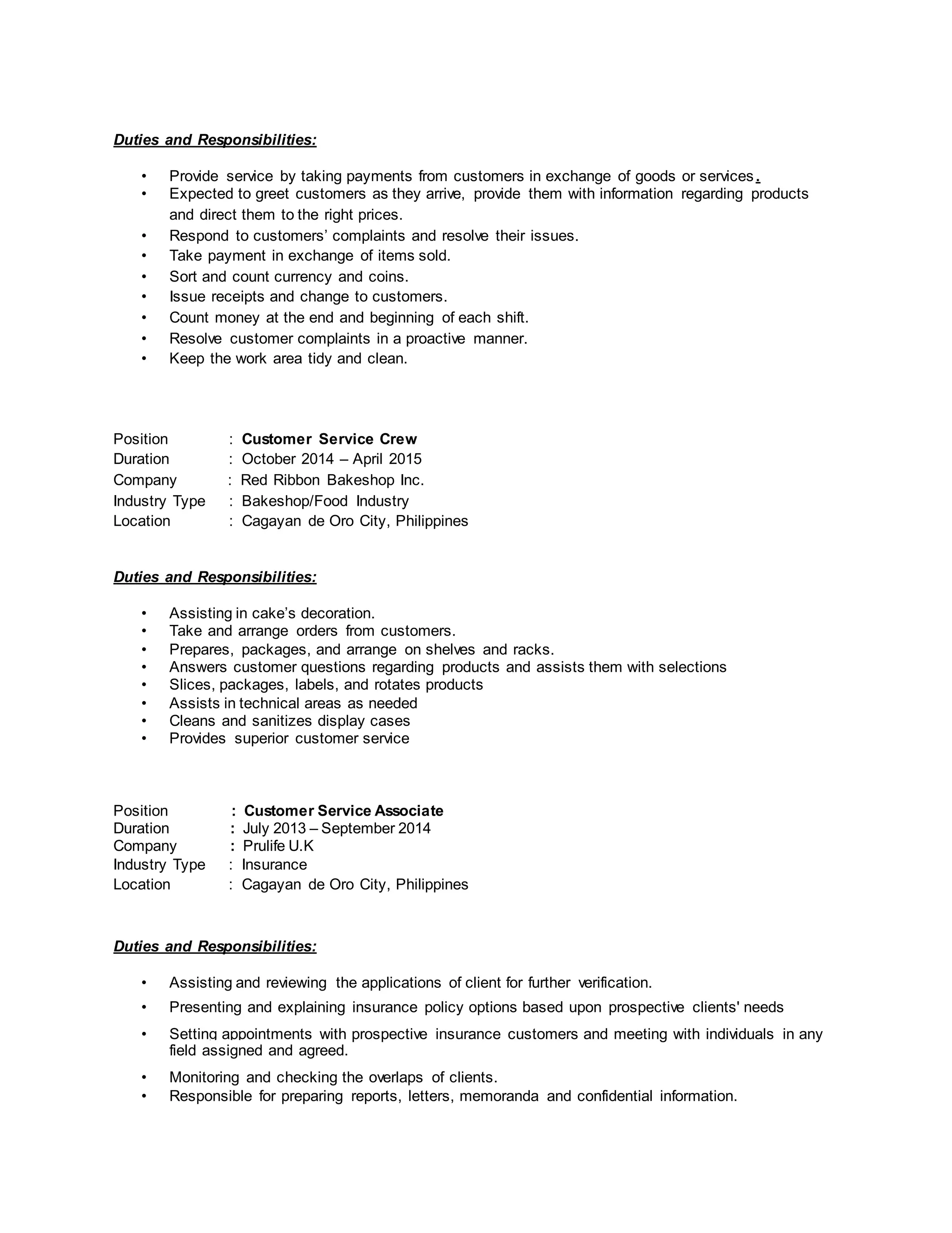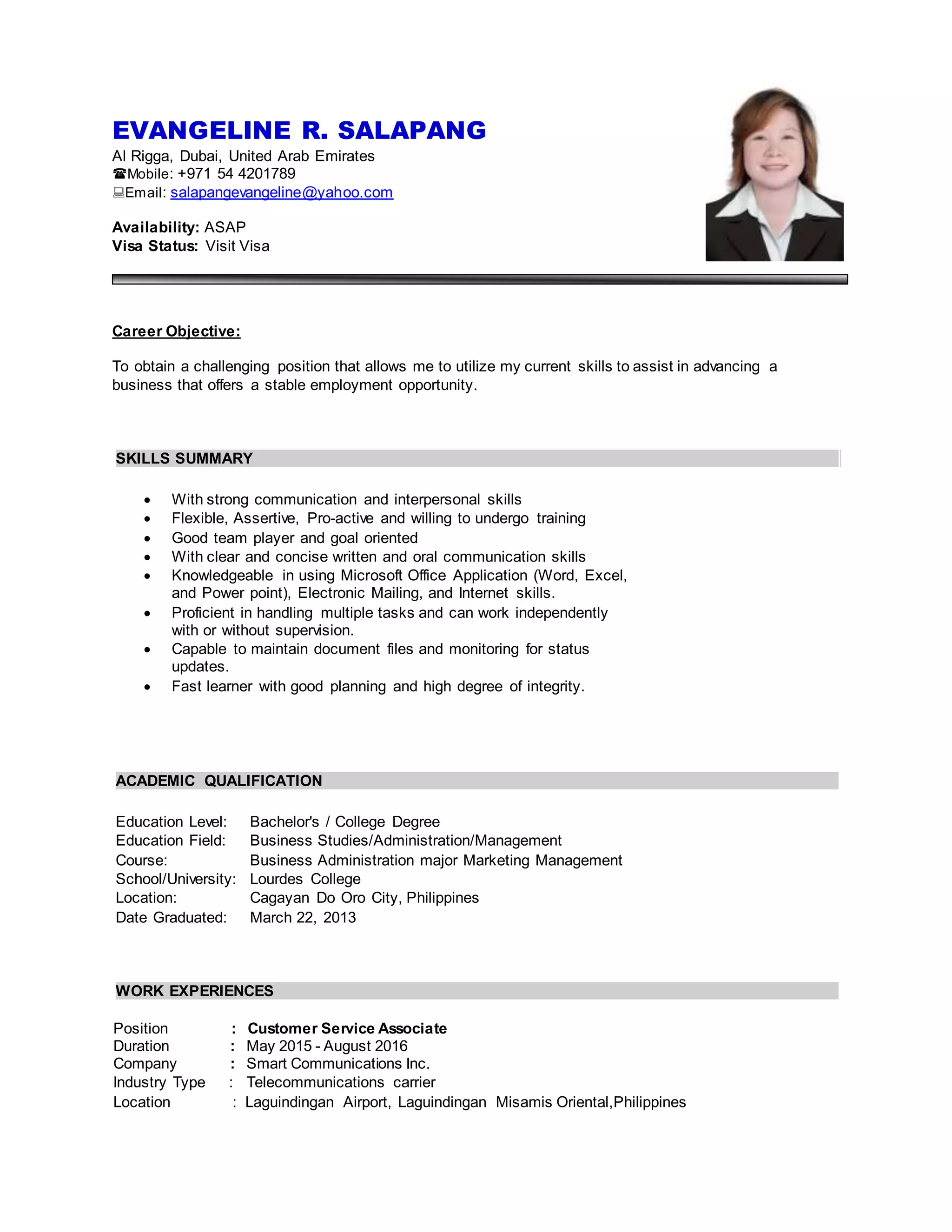 Evangeline Salapang is seeking a challenging position that allows her to utilize her skills and experience in business administration and customer service. She has over 5 years of experience in customer service roles in the telecommunications, food, and insurance industries. She has strong communication, planning, and computer skills. Salapang holds a Bachelor's degree in Business Administration from Lourdes College in the Philippines and has participated in training programs on business development and entrepreneurship.