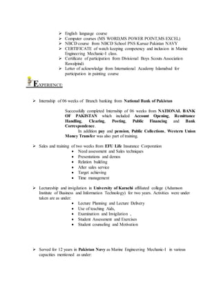 This document provides biographical information about Wasim Altaf, including his education history, work experience, skills, and additional information. He has an MBA in marketing from the University of Karachi and an MS in management sciences. He has over 12 years of experience in the Pakistan Navy as a Marine Engineering Mechanic-I and has also worked as a lecturer, interned at the National Bank of Pakistan, and done sales and training for EFU Life Insurance Corporation. His skills include technical expertise, communication, teaching, and computer proficiency.