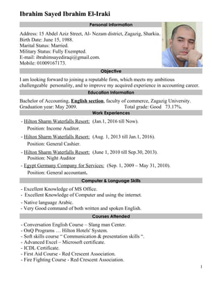 Ibrahim Sayed Ibrahim El-Iraki is seeking an accounting position that matches his ambitious personality. He has a bachelor's degree in accounting from Zagazig University and over 7 years of experience in accounting roles. He is proficient in MS Office, computer skills, and has excellent written and spoken English abilities. He has also taken several courses to improve his skills in areas like communication, Excel, and safety training. His references include managers from his current employer, Hilton Sharm Waterfalls Resort, where he has worked in roles such as Income Auditor, General Cashier, and Night Auditor.