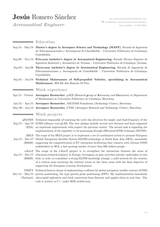 This document contains the resume of Jesús Romero Sánchez, an aeronautical engineer. It lists his education including a master's degree in aerospace science and technology and bachelor's degrees in aeronautical engineering. It also outlines his work experience as an aerospace researcher and lists relevant projects he has worked on, which involve GNSS technologies. Publications and languages/skills are also included.