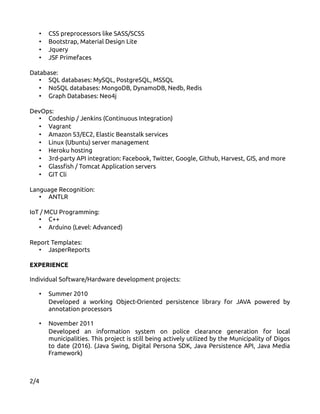 This document contains a summary of John Philip Solano's skills and experience as a web applications developer. Over the past 5 years, he has worked on numerous projects utilizing technologies like AngularJS, React, Node.js, Java, and more. He has experience as both a front-end and back-end developer, and has led teams on projects involving educational systems, election management systems, and other applications. His skills include programming languages, frameworks, databases, and DevOps tools.