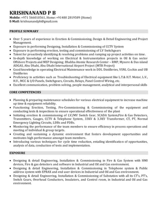 Krishnanand P B has over 5 years of experience in electrical engineering projects. He has experience in design, installation, and commissioning of electrical systems including CCTV, switchgears, and substations. He is proficient in project management, troubleshooting electrical equipment, and ensuring safety standards. Currently he works as an Electrical Engineer for ANEL Emirates on the Midfield Terminal Building project at Abu Dhabi Airport.