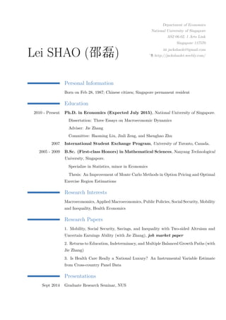 This document contains the curriculum vitae of Lei Shao, a PhD candidate in economics at the National University of Singapore. It outlines his education history, research interests in macroeconomics and applied public policies, three published research papers, teaching experience, awards and scholarships, and references. His job market paper co-authored with Professor Jie Zhang examines the effects of declining intergenerational mobility and rising social security on household savings, wealth, and income distributions.
