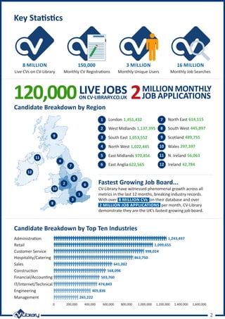 CV-Library is the UK's fastest growing job board with over 8 million CVs on its database and 2 million job applications per month. London has the most registered candidates, followed by the West Midlands and South East of England. The top industries represented are construction, administration, retail, and customer service. CV-Library advertises on trains, buses, the London Underground, and in gyms nationwide to attract candidates offline. It offers recruitment solutions like premier job adverts and targeted email campaigns to help employers find quality candidates.