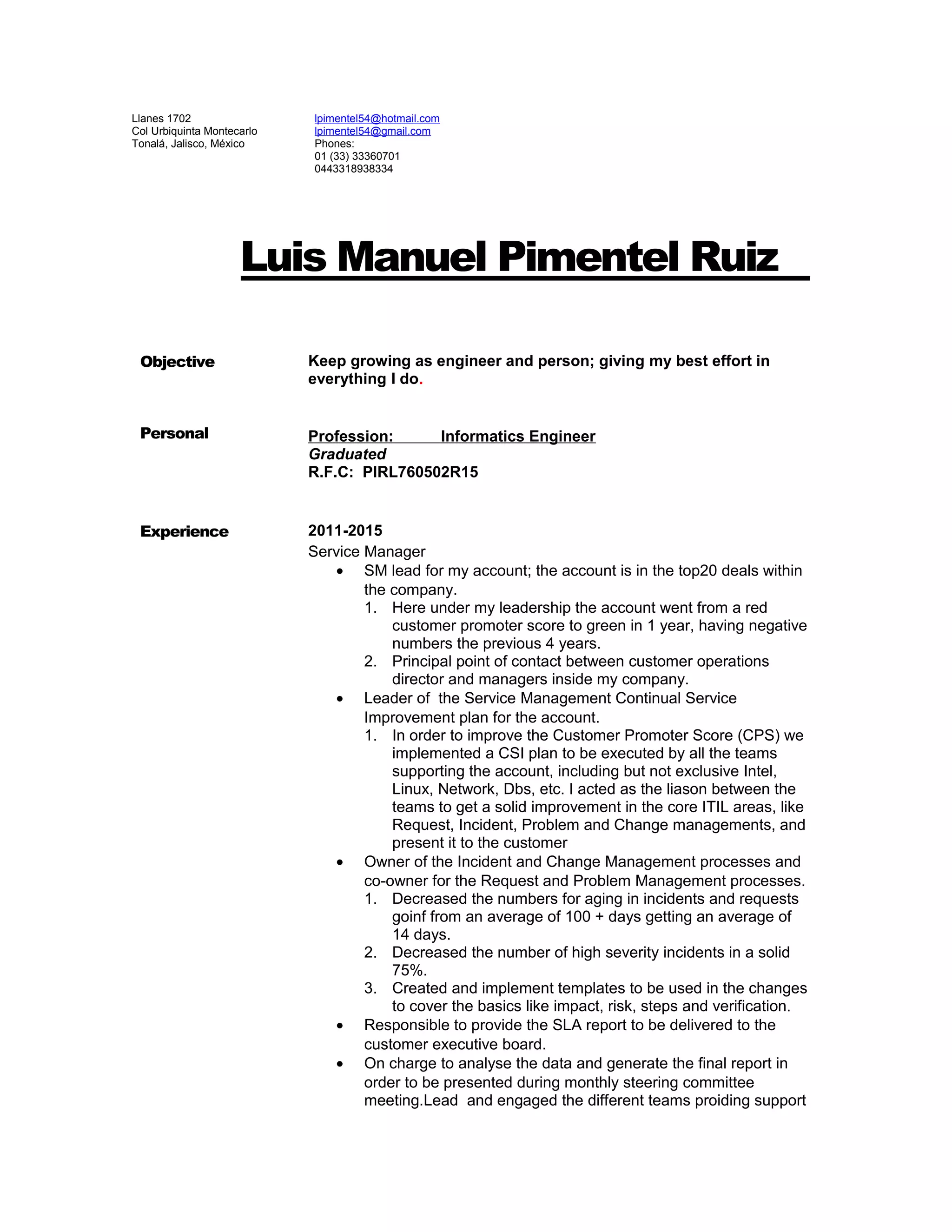 Luis Manuel Pimentel Ruiz is an Informatics Engineer from Guadalajara University with over 20 years of experience in IT service management roles. He has held positions such as Service Manager, Business Analyst, Support Engineer, and Project Manager. Pimentel Ruiz has extensive experience implementing ITIL best practices and leading continual service improvement initiatives to improve customer satisfaction scores. He is proficient in both English and Spanish.