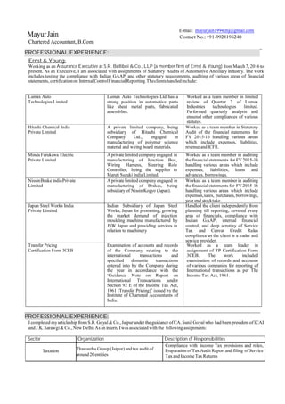 Mayur Jain is a Chartered Accountant working as an Assurance Executive at S.R. Batliboi & Co., LLP (Ernst & Young) since 2016. He has experience auditing several automotive ancillary companies. Some of the clients he has worked with include Lumax Auto Technologies, Hitachi Chemical India, Minda Furukawa Electric, and Nissin Brake India. For these audits, he has tested compliance with Indian GAAP, audited various areas of financial statements, and certified internal control over financial reporting. He also has experience with transfer pricing certification and working independently with clients like Japan Steel Works India. Prior to this, he completed his articleship and gained experience