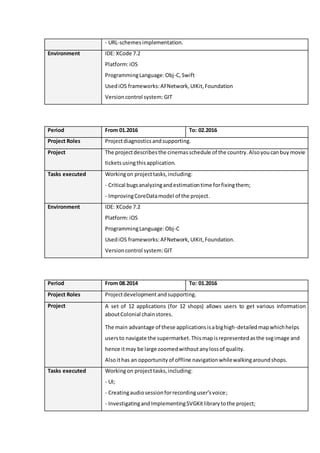This document is a curriculum vitae for an iOS developer. It details the applicant's education as a mathematician and system analyst. It also provides an extensive work experience summary, listing 14 separate iOS development projects the applicant worked on between 2012-2016. These projects cover a wide range of applications, from games to maps to social apps. For each project, the applicant's role and responsibilities are described, along with the technologies used like Xcode, Swift, Objective-C, and various iOS frameworks.