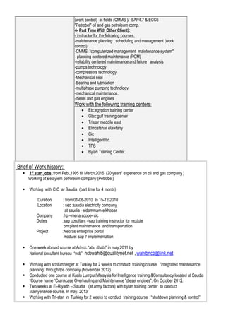 Mohamed Salah Mostafa Alsharkawy provides his curriculum vitae. He has over 20 years of experience in maintenance engineering, planning, and reliability centered maintenance. He is currently working as a mechanical instructor at the National Industrial Training Institute in Saudi Arabia. Previously, he worked for Belayiem Petroleum Company in Egypt and has extensive experience working with SAP and computerized maintenance management systems. He is proficient in English and seeks new job opportunities.