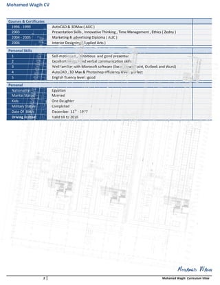 Mohamed Wagih is seeking a challenging position in architectural drafting. He has over 15 years of experience in roles like administrator, architectural draftsman, and real estate brokerage. His experience includes handling customer requests, 2D and 3D drawings, brochure design, and implementing designs for client projects. He has a BSc in Commerce from Cairo University and certificates in courses like AutoCAD, 3DMax, presentation skills, and interior design. His skills include self-motivation, communication, Microsoft Office proficiency, and fluency in AutoCAD, 3DMax and English.