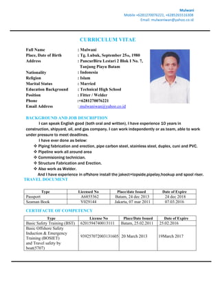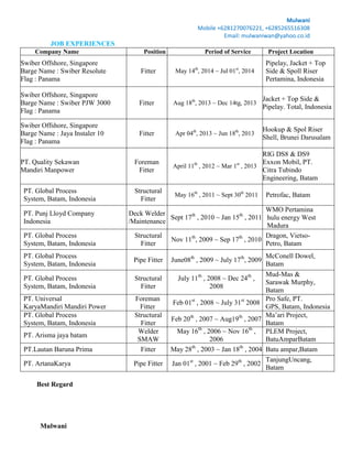 Mulwani has over 10 years of experience as a fitter and welder in construction, shipyard, oil, and gas projects. He has the necessary safety certifications like BST and BOSIET that are valid through 2016-2017. He is proficient in English and has experience with tasks like piping fabrication, pipeline work, commissioning, structure fabrication, welding, and offshore installation of jackets, topsides, pipelines, and spools. He has worked on numerous projects in locations like Singapore, Indonesia, Brunei, and Vietnam for companies such as Swiber Offshore, Pertamina, Shell, ExxonMobil, and Petrofac.
