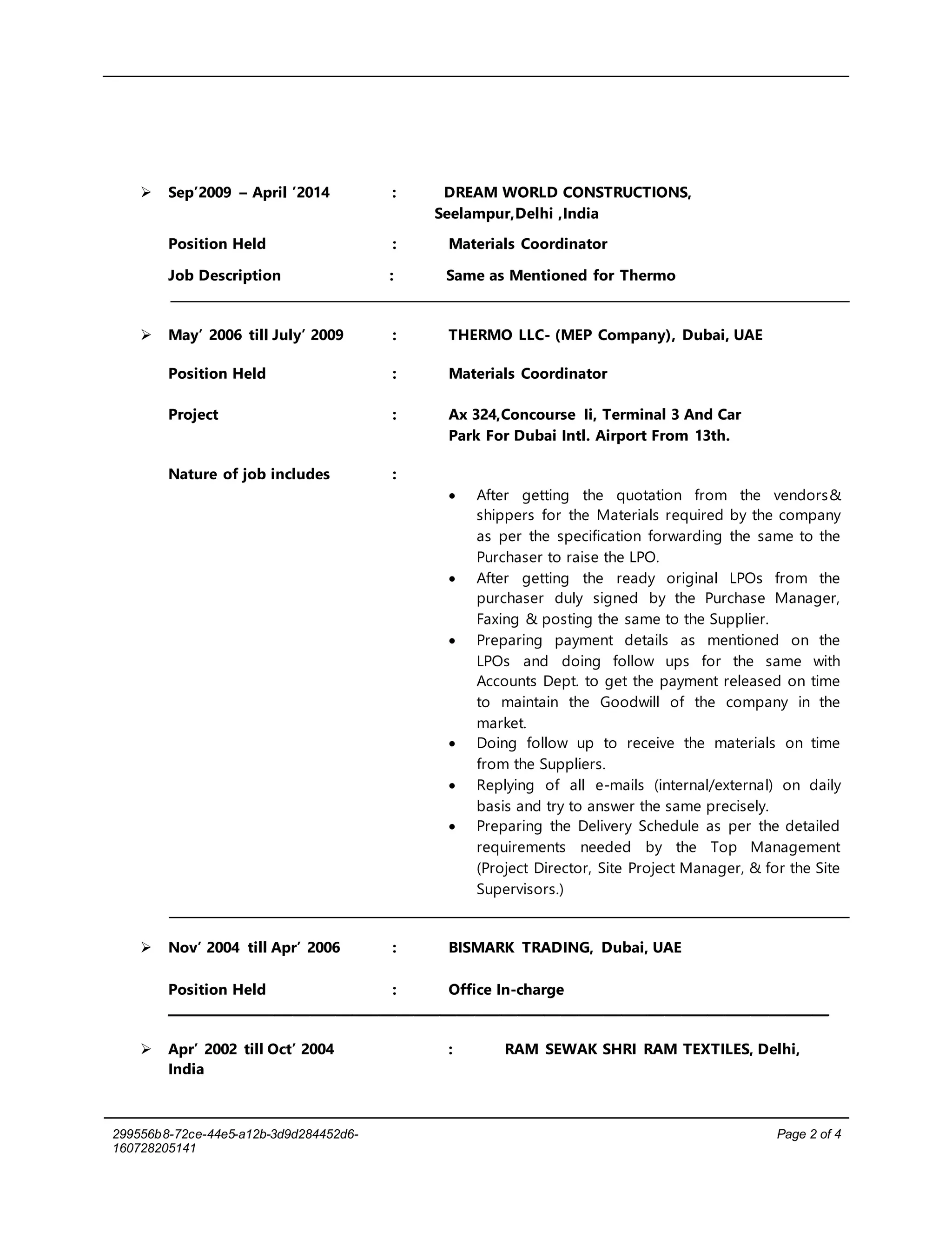 The document is a curriculum vitae for Nalin Kumar Rohatgi. It outlines his personal details, qualifications, skills, work experience and responsibilities in various roles in logistics, materials coordination, purchasing, accounts, and sales over a career spanning three decades working in India and the United Arab Emirates. His most recent experience was as a Logistics Coordinator in Dubai from 2014 to 2016.