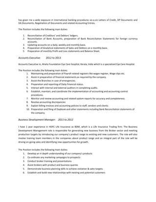 Nebin Mathew is an experienced MBA finance and marketing professional seeking an accounting, finance, or auditing position. He has over 5 years of experience in accounts finalization, internal audit, reconciliation of accounts, and preparation of financial statements and reports. His educational background includes an MBA from DePaul Institute of Science And Technology and a B.Com from Nirmala College. He is married and holds an employment visa in Saudi Arabia.