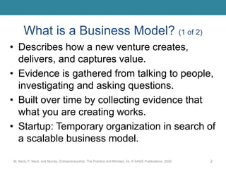 The document discusses business models, emphasizing their role in how new ventures create, deliver, and capture value. It outlines key components such as offerings, customer segments, infrastructure, financial viability, and the importance of a strong customer value proposition (CVP). Additionally, it highlights different types of business models and customer segments needed to meet various market demands.