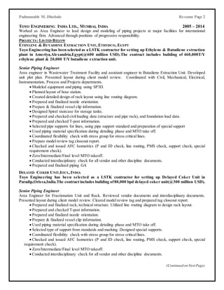 Padmanabh M. Dhobale is a skilled piping design engineer with over 11 years of experience in layout detailing and 3D modeling. He has extensive experience working on large oil and gas projects in countries like the UAE, Kuwait, Oman, Egypt, India, Singapore, and Saudi Arabia. Some of his responsibilities have included developing overall plot plans, finalizing nozzle orientations, preparing rack designs, performing takeoffs, coordinating with other disciplines, and checking documents. He is proficient in software like PDMS, SP3D, AutoCAD, and has a post-graduate diploma in piping design.
