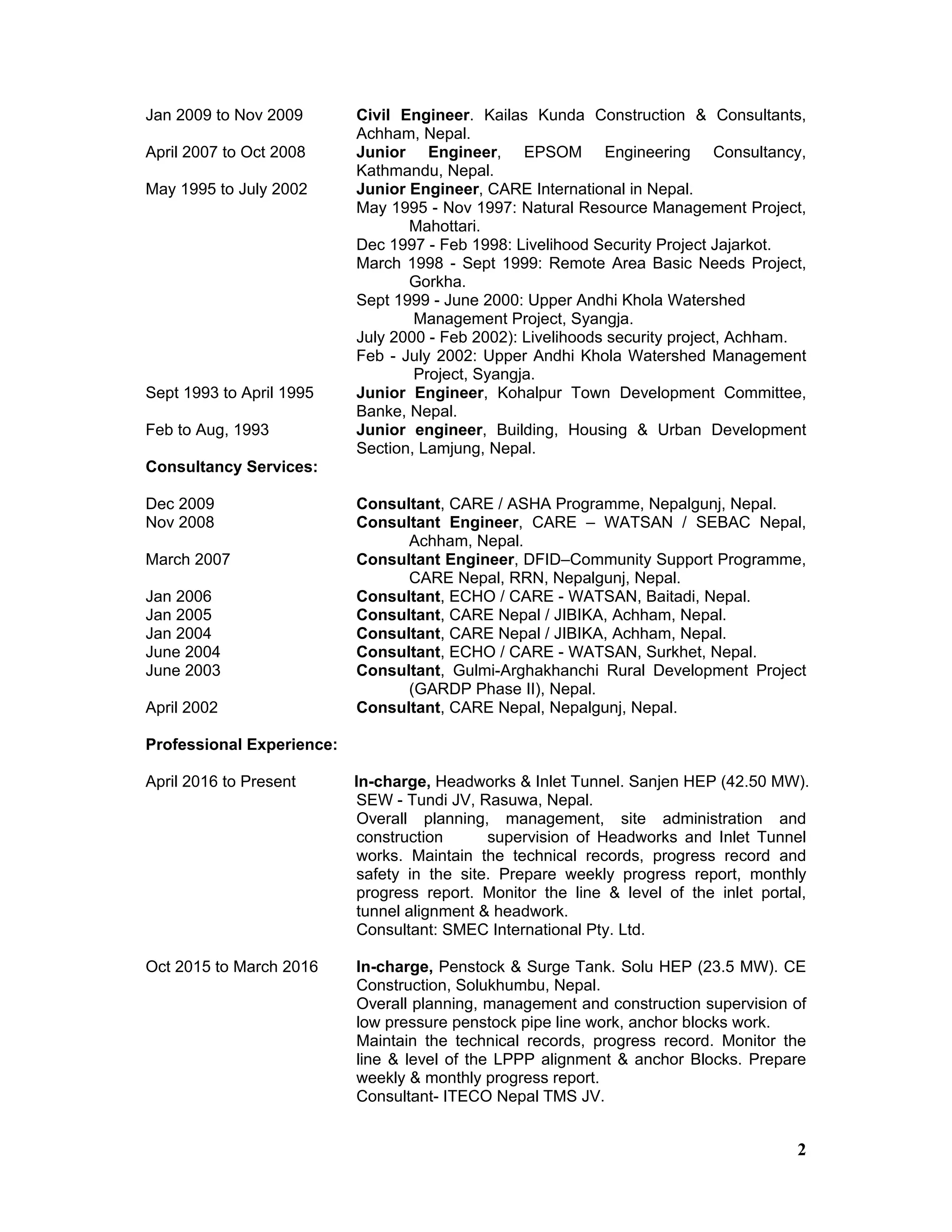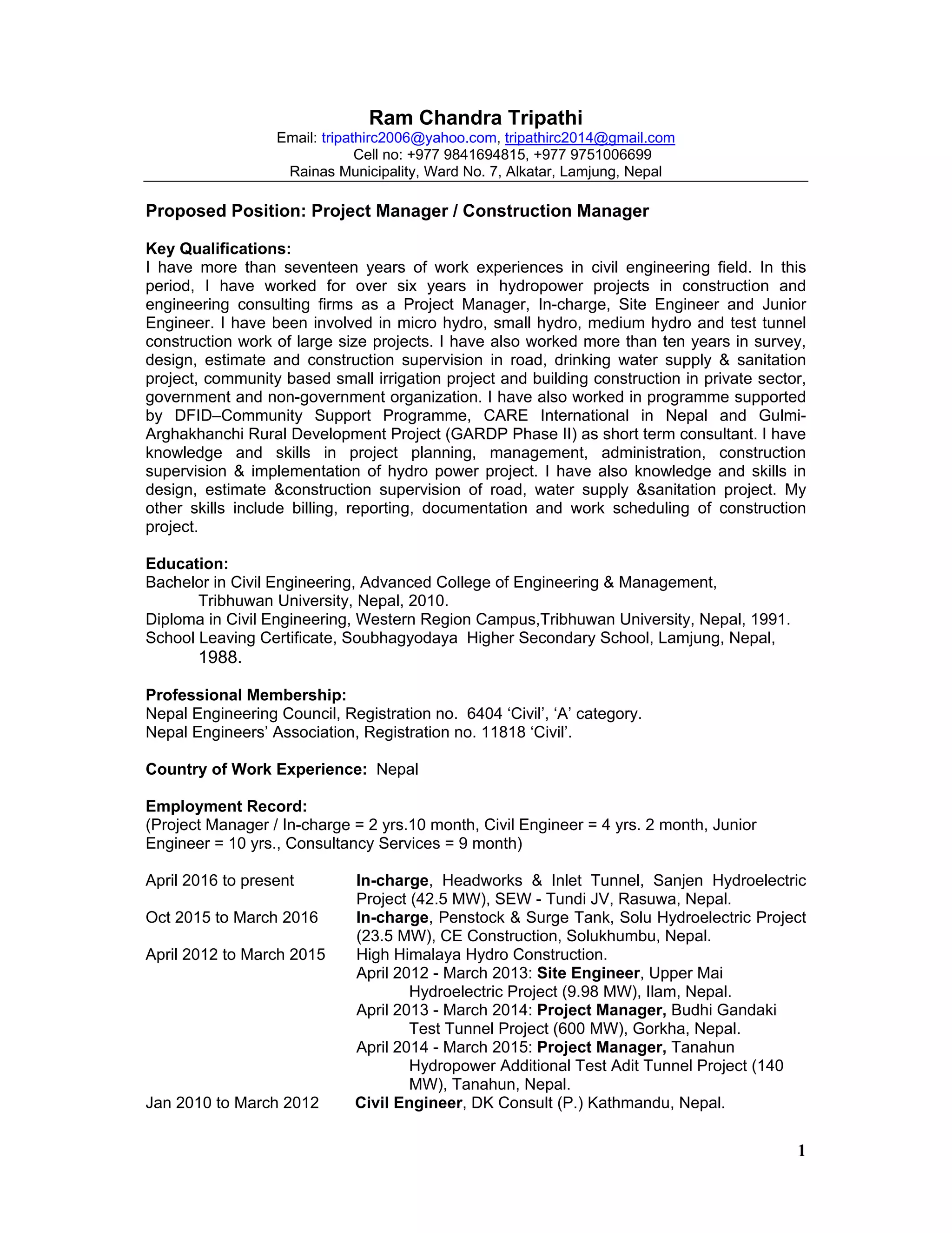 Ram Chandra Tripathi has over 17 years of experience in civil engineering projects in Nepal. He has worked as a project manager, site engineer, and junior engineer on hydropower, road, water, and sanitation projects. His experience includes planning, management, construction supervision, and implementation. He holds degrees in civil engineering and has received training in tunnel construction, soil conservation, and computer skills like AutoCAD.