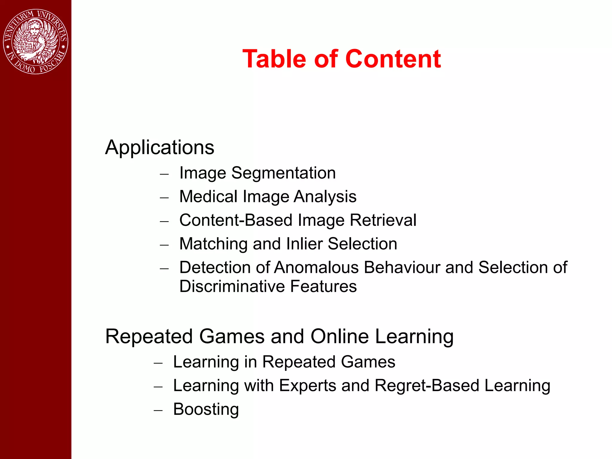 - The document contains a table of contents listing applications of image segmentation, including medical image analysis.