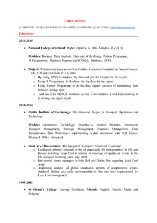 John David has over 15 years of experience in data analytics, IT support, and database engineering. He holds a Higher Diploma in Data Analytics and BSc in Transport Operations and Technology from the National College of Ireland and Dublin Institute of Technology, respectively. His past roles include providing IT support at a college helpdesk, designing and maintaining SQL databases as a Database Engineer at Dell Computer, and using Excel, Access, Python, R, and other tools to analyze data and build data warehouses and data marts.