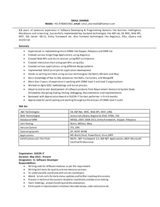 Rahul Sharma has over 5 years of experience developing software using technologies like ASP.NET, C#, AngularJS, and SQL Server. He has experience creating single page applications, RESTful APIs, and interactive charts. He is proficient in .NET development and has worked on projects involving document management systems, business intelligence tools, and e-learning platforms.