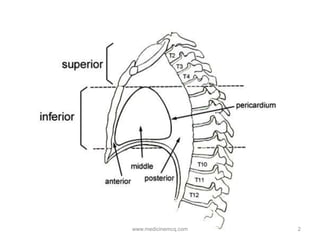 The document discusses the anatomy and positioning of the heart. It notes that the heart rotates 45 degrees during development, with two thirds of the right atrium and right ventricle facing anteriorly and two thirds of the left ventricle and most of the left atrium facing posteriorly. The left atrium forms most of the posterior aspect of the heart and most of the base. The right ventricle forms most of the anterior aspect, covering most of the left heart in front.