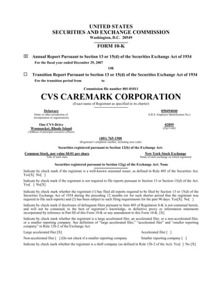 This document is CVS Caremark Corporation's annual report filed with the SEC for the fiscal year ended December 29, 2007. It provides an overview of CVS Caremark following its merger with Caremark Rx, Inc. in March 2007. CVS Caremark operates in two business segments: Retail Pharmacy and Pharmacy Services. The Retail Pharmacy segment includes CVS/pharmacy retail stores, MinuteClinic health clinics, and online retail. The Pharmacy Services segment provides pharmacy benefit management services and mail order pharmacy services. In fiscal year 2007, CVS Caremark filled over 1 billion prescriptions and derived 95% of its pharmacy revenues from managed care and other third party plans.
