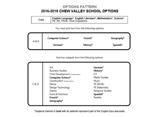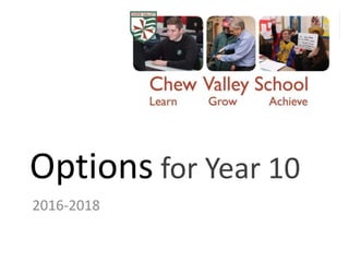 This document provides information about course options for students entering Year 10. It outlines the core curriculum of subjects like English, maths, and science. Students can choose from four option subjects in addition to the core. A variety of GCSEs, BTECs, and Cambridge Nationals are available as options. The document explains qualifications and considers factors for students to weigh when selecting their options. Key dates in the options process are also provided.
