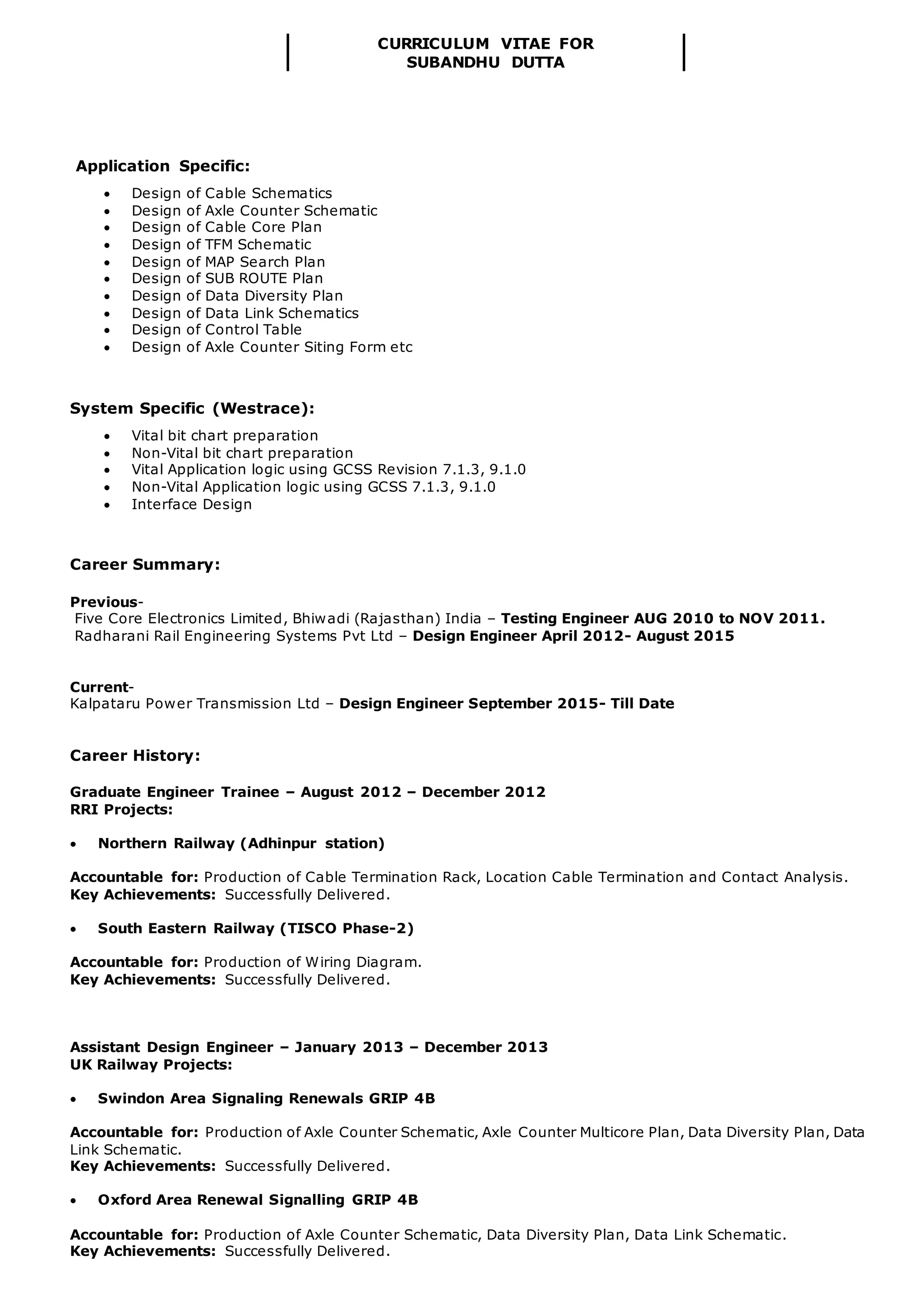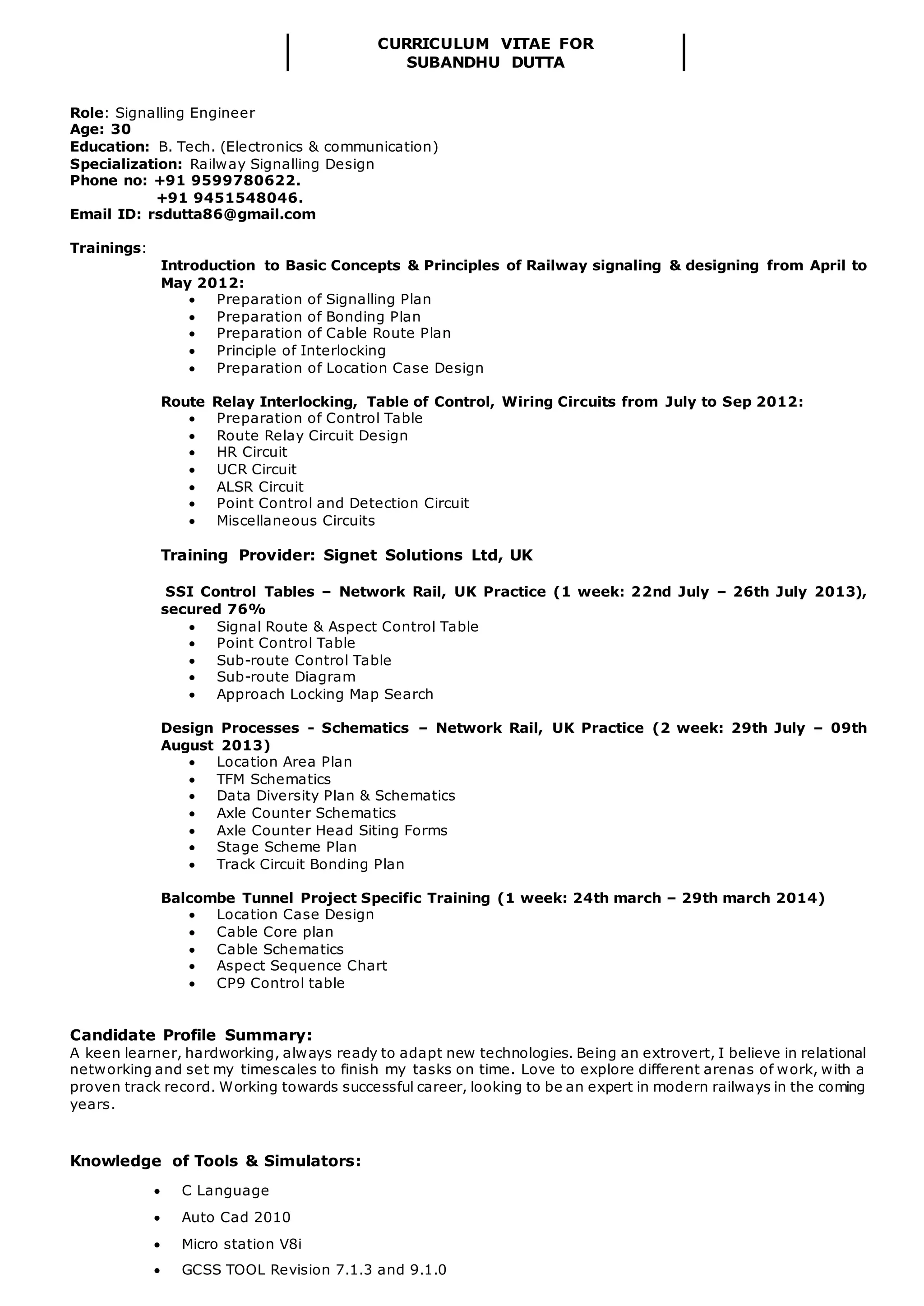 Subandhu Dutta is a 30-year-old signalling engineer with over 10 years of experience in railway signalling design. He holds a B.Tech in electronics and communication with specialization in railway signalling design. He has worked on numerous railway signalling projects in India and the UK, producing designs such as control tables, wiring diagrams, cable plans, and axle counter schematics. Currently working as a design engineer at Kalpataru Power Transmission Ltd, his goal is to take on more challenging roles in railway signalling and diversify his experience.