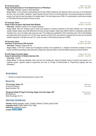 Swapnil Deshmukh has an M-Tech in VLSI Design with 6 months of experience in validation testing of PCIe devices using various tools. He has experience designing and verifying architectures in Verilog and writing testbenches, monitors, and checkers. He is proficient in Verilog, Perl, Python, and various EDA tools like Cadence and Altera tools.