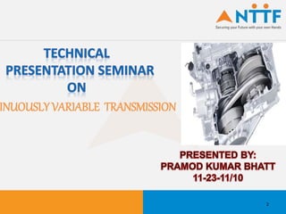 This document provides an overview of continuously variable transmissions (CVTs). It discusses the history of CVTs, including early sketches by Leonardo Da Vinci. It describes the main components and designs of CVTs, such as pulley-based, toroidal, and hydrostatic systems. The document outlines the advantages of CVTs, such as improved acceleration and fuel efficiency, as well as disadvantages like higher costs. It also discusses future applications of CVTs in electric vehicles and how the technology continues to develop.