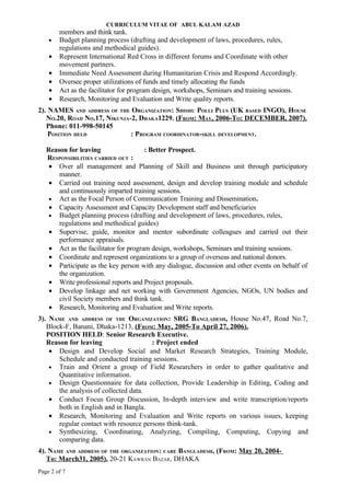 This document provides a curriculum vitae for Mr. Abul Kalam Azad, including his contact information, education background, languages spoken, and employment history. Over the past 28 years, Mr. Azad has held responsible positions with international humanitarian and development organizations, gaining experience in areas such as training, humanitarian aid, and social development. His employment history includes positions with the International Committee of the Red Cross, Shishu Polli Plus, SRG Bangladesh, CARE Bangladesh, and Assistance for Legal and Humanitarian Affairs, where he carried out duties related to program coordination, research, capacity building, and project development.