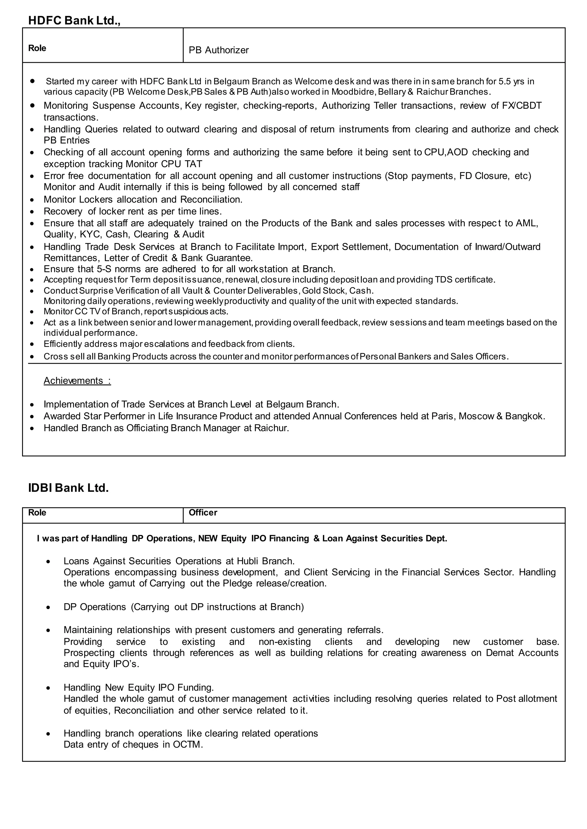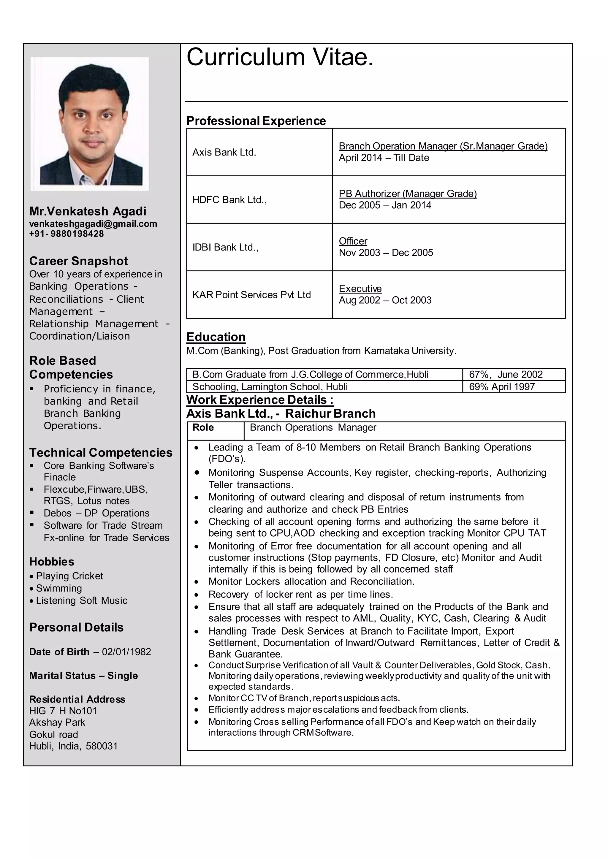 This document is a resume for Mr. Venkatesh Agadi summarizing his professional experience and qualifications. He has over 10 years of experience in banking operations including reconciliations, client management, and relationship management. He is proficient in various banking software and currently works as the Branch Operations Manager at Axis Bank in Raichur, India, managing a team of 8-10 people. Previously he held roles at HDFC Bank, IDBI Bank, and Kar Point Services in operations, personal banking, and loans. He has a M.Com in Banking and B.Com degree.