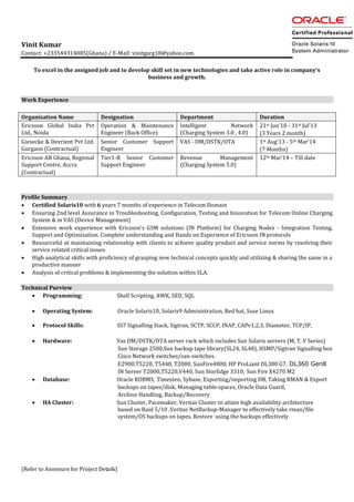 Vinit Kumar has over 7 years of experience in telecom operations and maintenance. He currently works as a Senior Charging System Support Engineer for Ericsson in Ghana, providing tier 1 support for charging system 5.0 nodes. Previously he has worked for Ericsson in India and Giesecke & Devrient in India, supporting various telecom nodes. He is experienced in protocols like Diameter, INAP and technologies like Oracle Solaris, Linux and databases like Oracle. He has technical skills in areas like scripting, networking, hardware and aims to further develop his skills in new technologies.