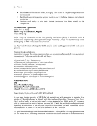 Manoj Sharma is seeking a senior managerial position with over 18 years of experience in media marketing and education management. He currently serves as Vice President of Operations for MKR Foundation for Education in Aligarh, India where he oversees operations, project management, finance, promotions and more. Prior to this role, he held leadership positions in media marketing for Hindustan Media Ventures and Amar Ujala Publications, successfully launching new editions and driving revenue growth. He has a law degree and qualifications in marketing, travel/tourism and commerce.