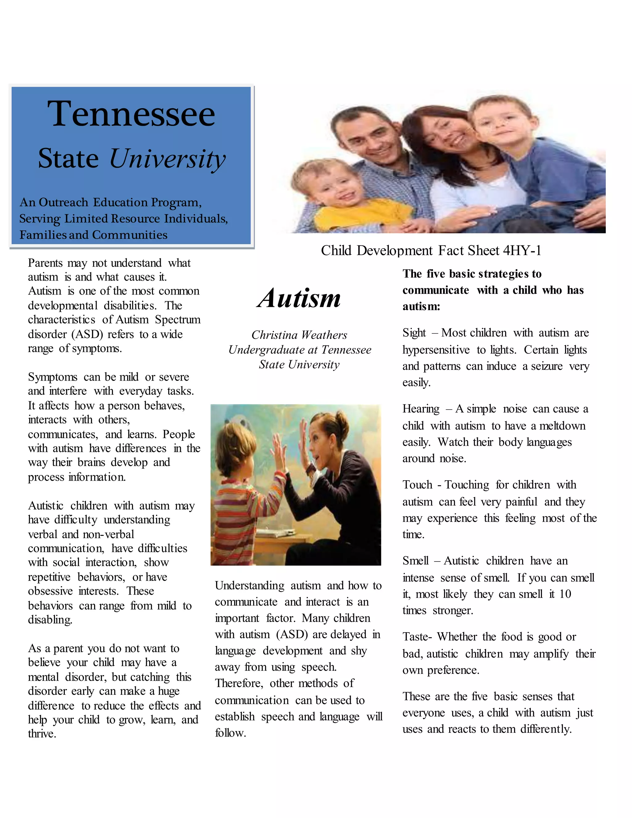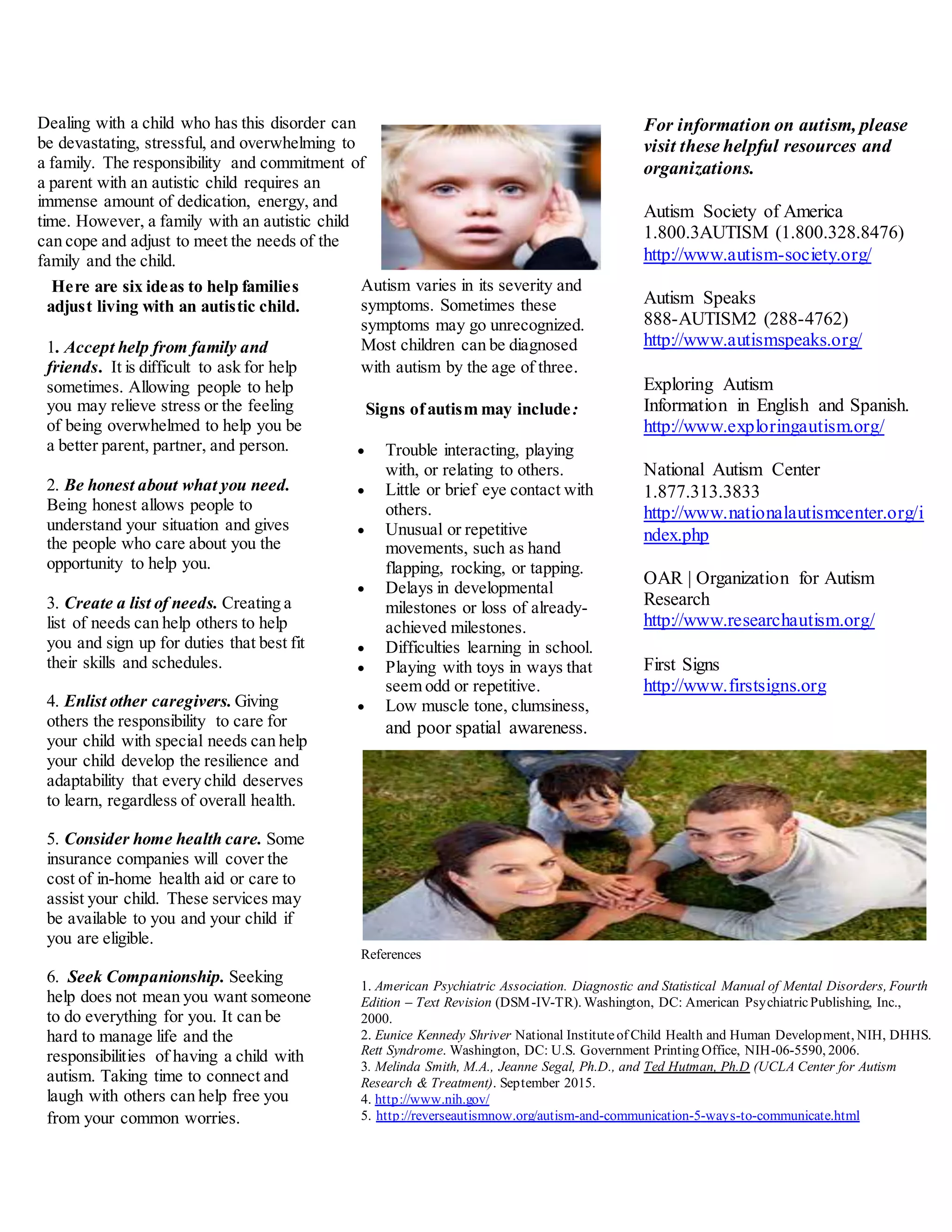 The document discusses autism and strategies for communicating with autistic children. It notes that autistic children have heightened senses and can be overwhelmed by things like lights, sounds, touch, smells, and tastes. It also provides information on signs of autism, including difficulties with social interaction and repetitive behaviors. The document emphasizes that early diagnosis is important so autism's effects can be reduced and children can learn and develop. It lists resources for more information on autism and provides tips for families in adjusting to and supporting an autistic child, such as accepting help, being honest about needs, and finding companionship.