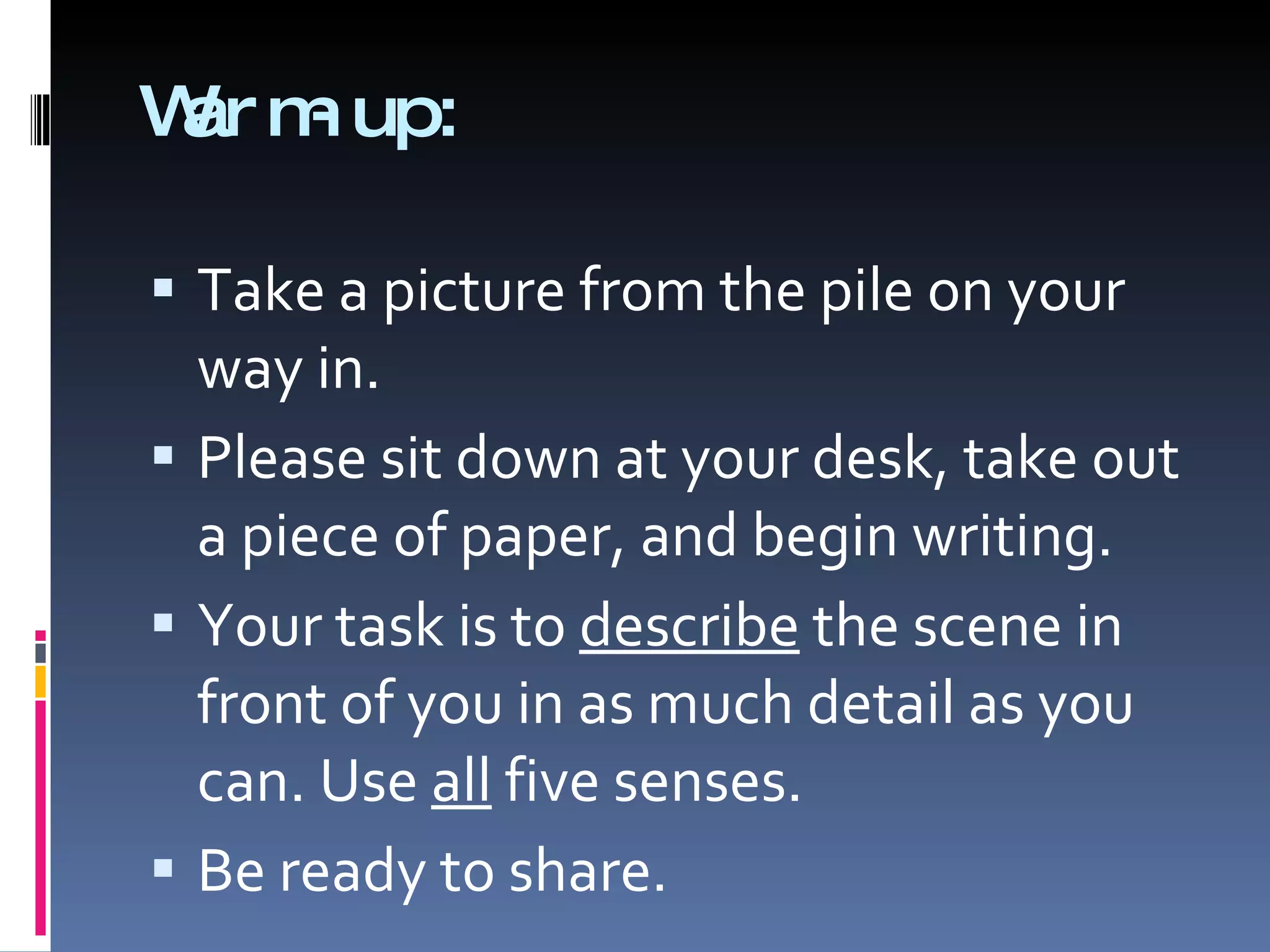 The document provides instruction on using imagery in writing. It defines imagery as description that engages all five senses to help readers visualize people, objects, and scenes. Students are given examples of imagery and exercises to practice incorporating more imagery into their own writing by showing rather than telling, using specific details and metaphors or similes rather than cliches or abstract terms. The homework assignment is to bring an object and comment on a peer's response to a sample essay describing a nature observation in vivid sensory detail.