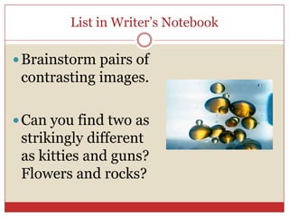 This document provides writing prompts and exercises for students to practice using sensory imagery and details. It includes prompts for students to write about contrasting images, sounds, tastes, smells, touch, and sights. The prompts encourage using specific and vivid descriptive language focused on the five senses. Students will complete short written responses to the prompts both in class and as homework.