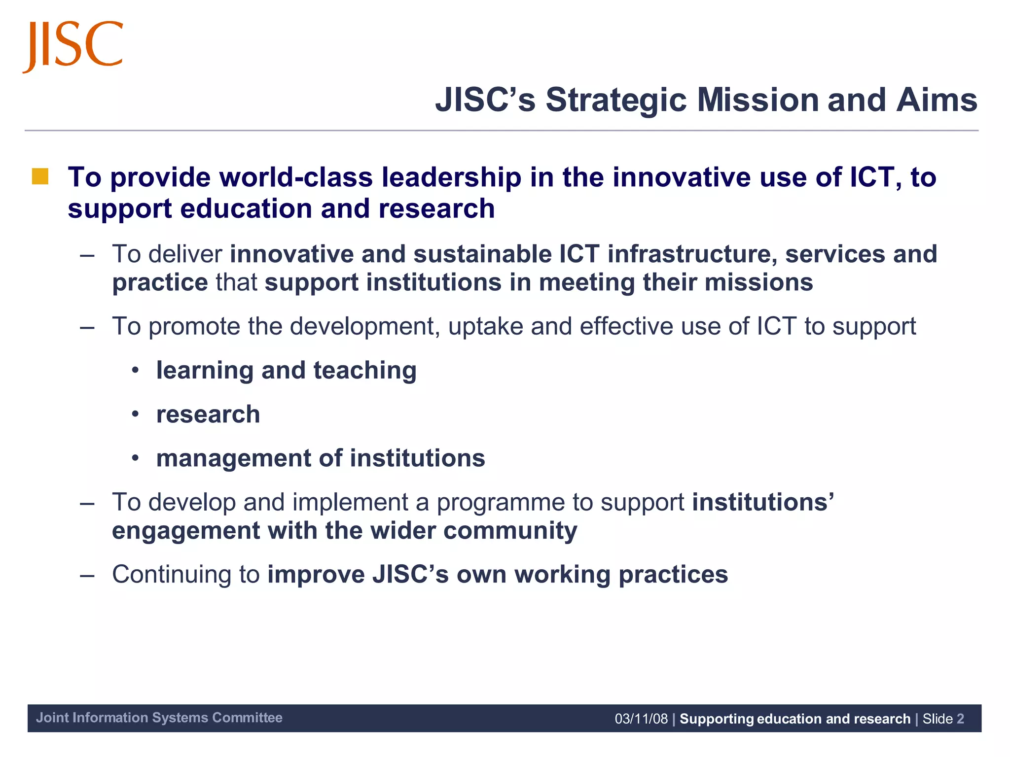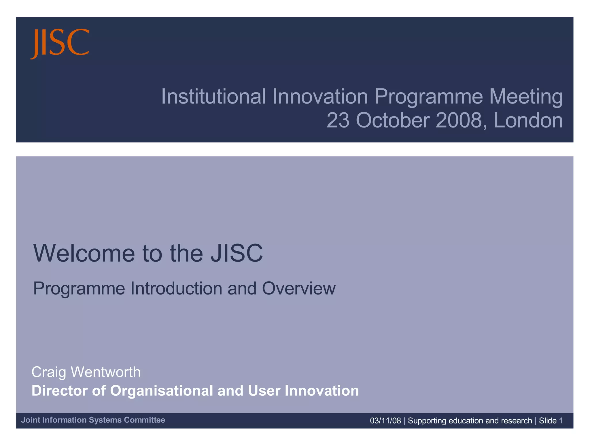 The document outlines the JISC Institutional Innovation Programme meeting held on October 23, 2008, highlighting the programme's objectives to enhance the use of ICT in education and research. It discusses various funding allocations, strategic activities, and future plans aimed at addressing institutional challenges, particularly in support of lifelong learning and sustainability. The meeting included project presentations and discussions on communications, branding, and programme evaluation.