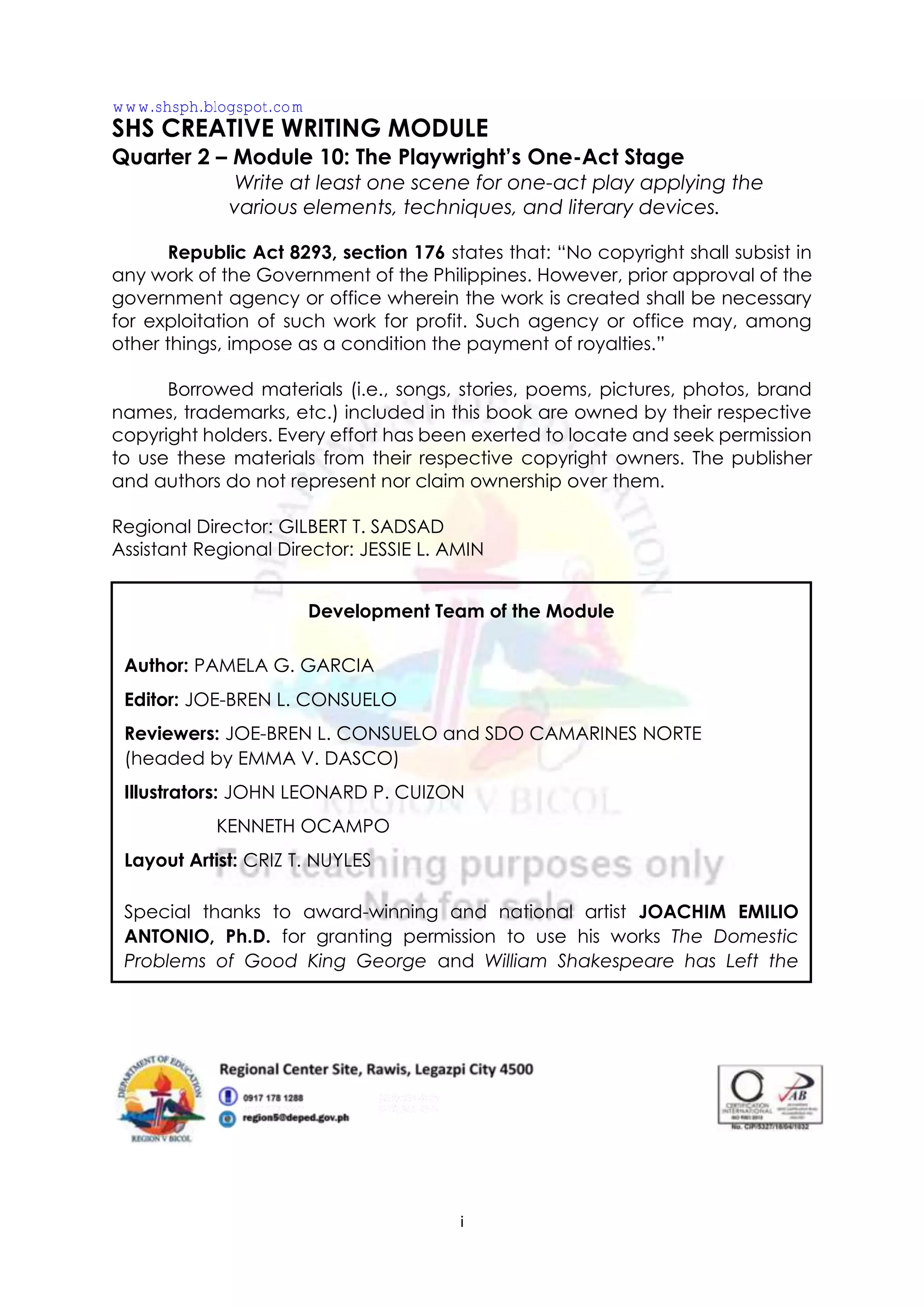This document provides information and guidelines for creating a one-act play as part of a creative writing module. It discusses elements of a one-act play such as characters, plot, structure and themes. It emphasizes that a good one-act play focuses on a single main action or problem within a minimal set and few scenes. It also lists different types of plot twists that could be used, such as mistaken identity or an unexpected accident. The document aims to equip learners with the tools needed to write an effective one-act play.