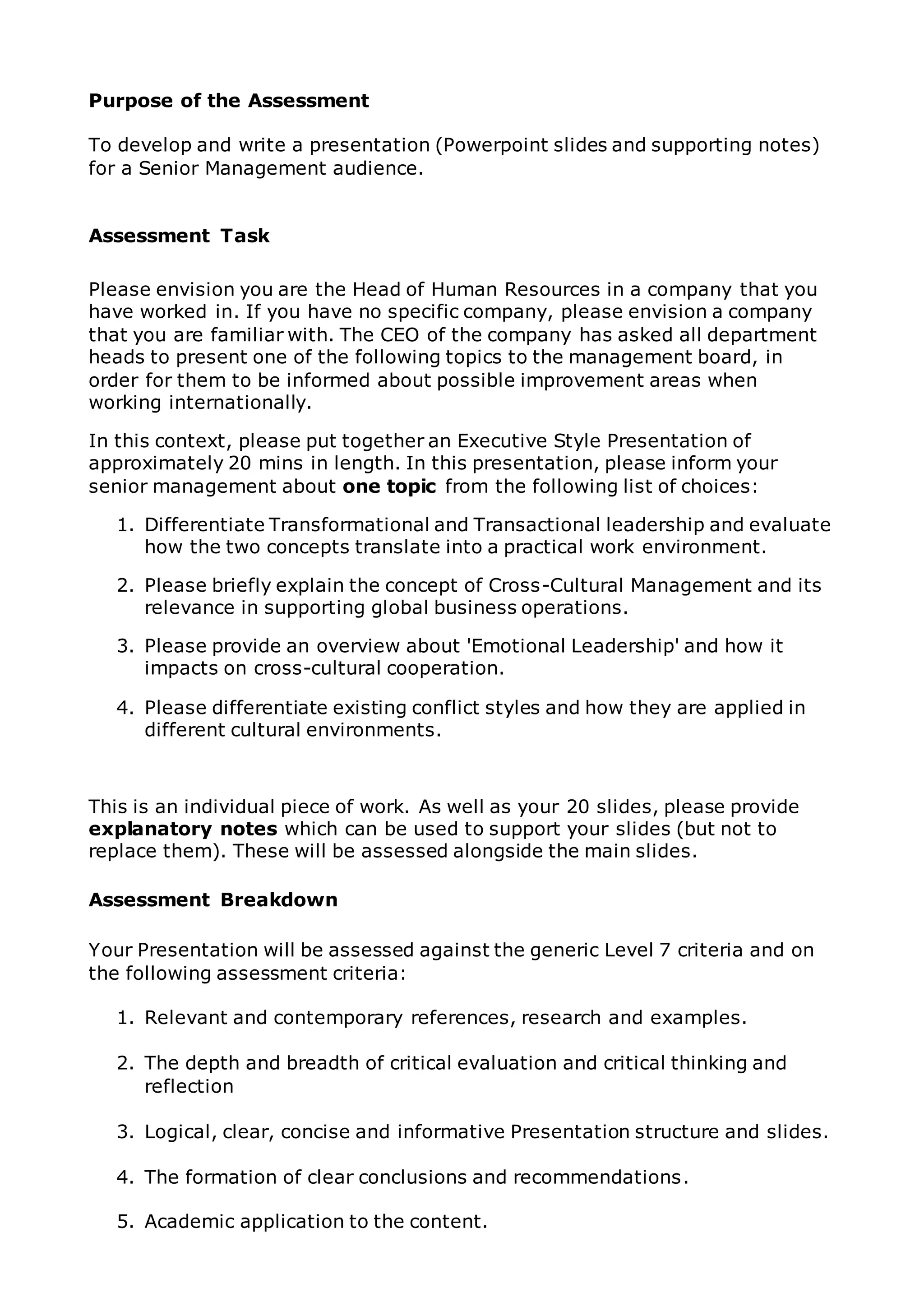 The document outlines an assignment for a presentation aimed at senior management on topics related to leadership and cross-cultural management, with a focus on developing research-informed content. It includes deadlines, assessment criteria, and guidelines for submission, emphasizing academic integrity and structure. The assignment is an individual task requiring comprehensive evaluation and presentation skills, with specified topics for focus.