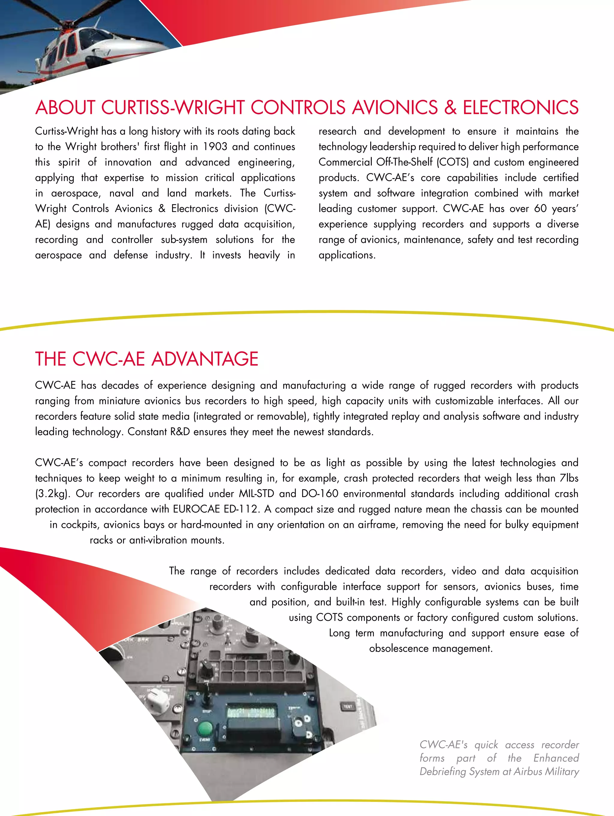 Curtiss-Wright Controls Avionics & Electronics (CWC-AE) specializes in designing and manufacturing crash-protected recorders for the aerospace and defense industries, with over 60 years of experience. Their products include a variety of configurable and compact data acquisition systems, featuring advanced solid state storage and extensive software integration for supporting various safety and monitoring applications. CWC-AE continually invests in research and development to maintain technology leadership and adherence to industry standards.