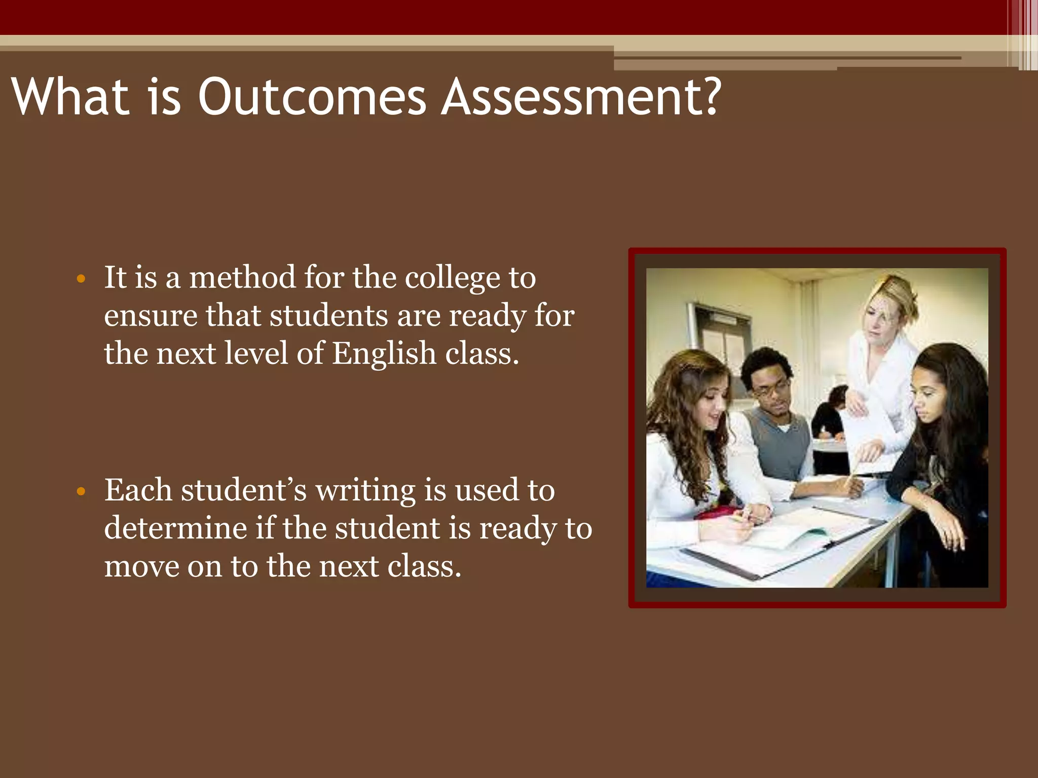Outcomes assessment (OA) is a process used to evaluate if students are prepared for the next level of English class, requiring passing an assessment essay to receive a course grade. Participation is mandatory for all English 015, 090, and 101 students who must submit a complete portfolio to be eligible, with assessments conducted in the last three weeks of the semester. If a student fails the OA essay, a portfolio review will be conducted, assessing their work throughout the semester to decide if they ultimately pass outcomes assessment.