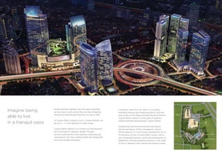 The document describes a new mixed-use development called Ciputra World Jakarta 2 located in the heart of Jakarta. It will include two residential towers and a serviced apartment tower set on 3.5 hectares of land, with 60% being green space. The development aims to provide a tranquil oasis within the city, with amenities like pools, gyms, and retail, while also being close to offices and entertainment. It is designed for urban living and young executives looking to be close to work in the commercial district.