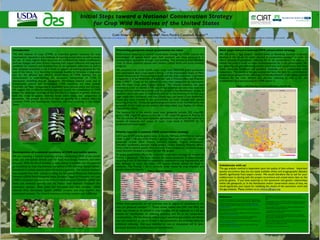 This document outlines initial steps toward developing a national conservation strategy for crop wild relatives (CWR) in the United States. It describes prioritizing CWR taxa based on their potential use value for crop improvement. A list of priority crops and genera was compiled. Over 3,000 native and non-native CWR and economically important wild taxa occurring in the US were inventoried. Gap analyses will identify locations of underrepresented genetic diversity to inform germplasm collecting and in situ conservation planning. The results will prioritize taxa and locations for efficient CWR conservation.