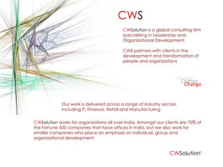 CW Solution is a global consulting firm based in India, specializing in leadership and organizational development, serving a diverse clientele including 70% of Fortune 500 companies. The firm offers various services such as executive sessions, organizational culture promotion, behavioral instruments, and development planning, aiming to enhance organizational effectiveness and profitability through measurable results. With a multicultural team of consultants, CW Solution employs innovative approaches to cater to the unique needs of each organization, focusing on structured and impactful change.