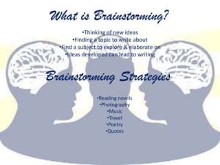 The document provides tips for brainstorming ideas to develop writing projects. It discusses strategies for brainstorming such as reading, photography, music, travel, and poetry. Brainstorming is used to generate ideas for writing novels, articles, poetry and other works. It allows creativity to flourish and helps a writer get started on a project by providing multiple options to consider. After brainstorming ideas, the document recommends actually writing and doing short exercises to practice. It also gives additional tips for writing such as carrying a notebook, finding the best time of day to write, revising drafts, getting feedback, and taking breaks to avoid feeling like writing is a chore.