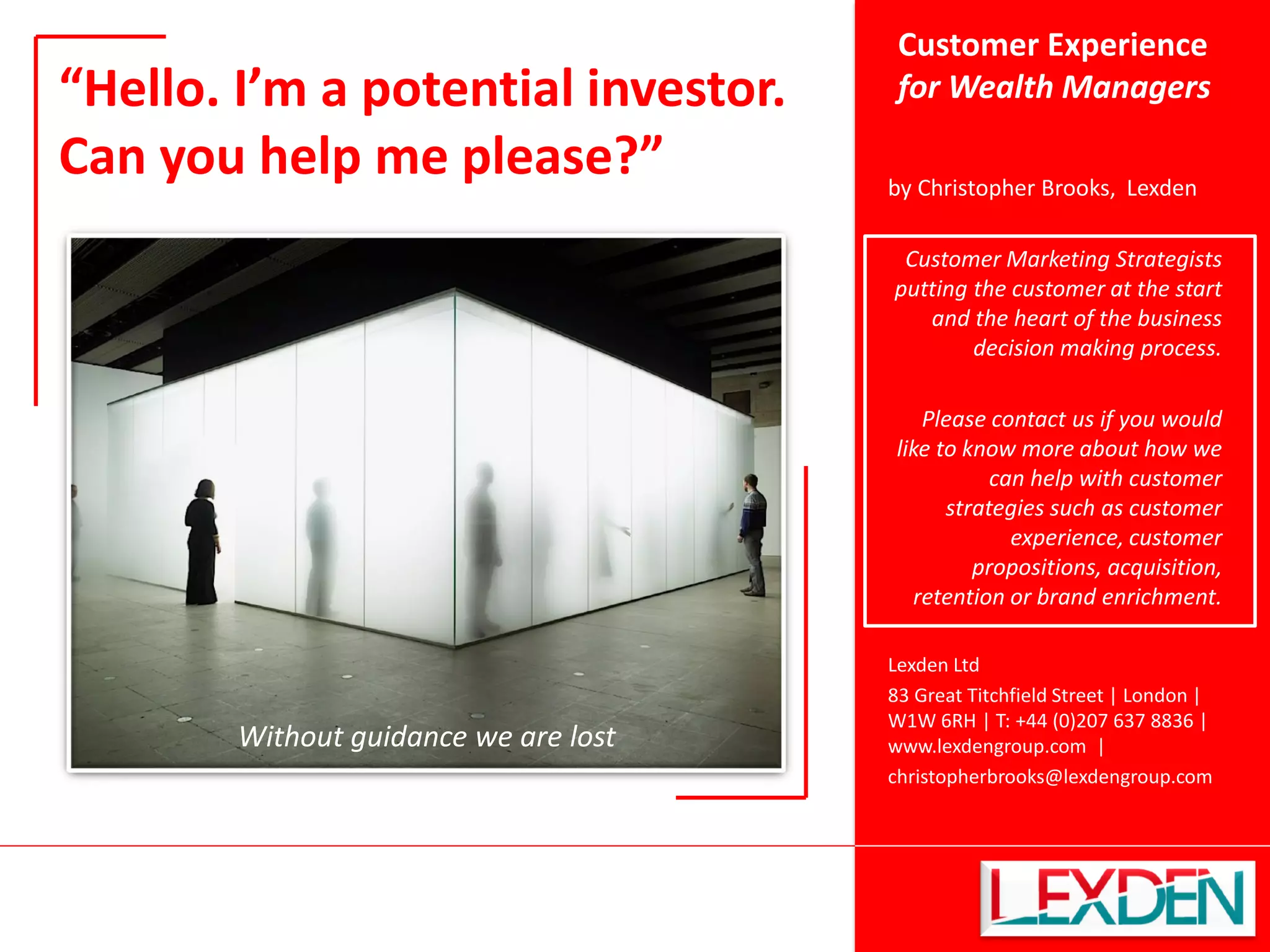 The document discusses the importance of customer experience (CX) for wealth managers, highlighting how it influences investor confidence and decision-making. It emphasizes that wealth managers must reclaim control of the customer experience from third-party advisers to capture client attention and preference. Lexden offers a CX maturity audit and improvement programs to help wealth management firms enhance their customer strategies for better financial performance.