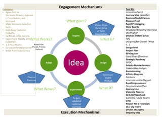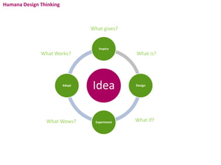 This document outlines Humana's design thinking process which includes idea generation, designing experiments to test ideas, and adopting successful solutions. It discusses engagement and execution mechanisms such as innovation sprints, journey mapping, business model canvassing, and rapid prototyping. The design thinking process aims to gain deep customer empathy through discovery tools and structured interviews to rapidly test ideas with customers and gather validated learnings to launch products and services. Principles of the process include making decisions based on facts, experimenting quickly with customers, and breaking from bureaucracy.