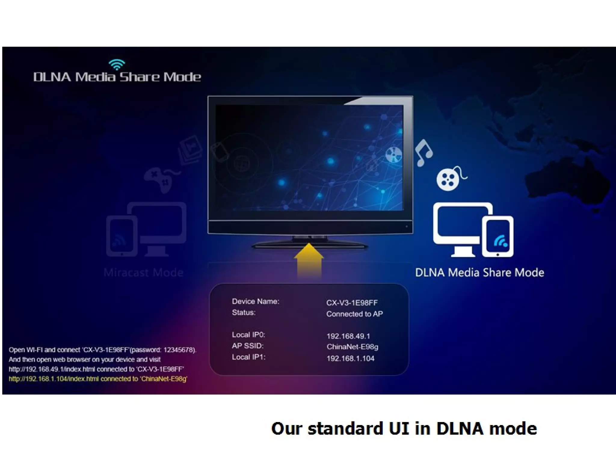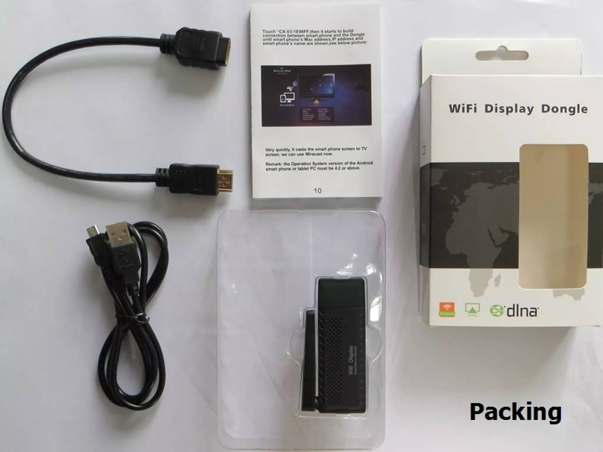 The document describes the Miracast Dongle (CX-V3S) produced by Shenzhen Sunchip Technology Co., Ltd. It allows casting from smartphones, tablets, and ultrabooks to HDTVs wirelessly via Miracast, DLNA, or AirPlay. It supports Android 4.2+, Windows 8.1 devices for Miracast and any Android or iOS 6/7 devices if they have DLNA. The dongle has an ARM Cortex A9 processor, 256MB RAM, built-in WiFi, and can be upgraded via OTA software updates while connected to the Internet. It is priced at $14 per unit for orders of 1000 pieces.
