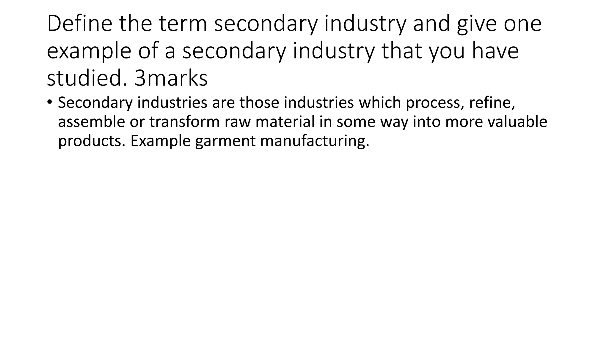 The document discusses economic development and activities in the Caribbean. It defines key terms like secondary industries and economic activities. It also outlines challenges facing industries like fishing, agriculture and manufacturing in Caribbean countries. Specifically, it notes that overfishing has depleted fish stocks in Belize and that shrimp trawling damages the seabed. It also explains how preferential trade agreements and labor shortages have impacted agriculture in the Caribbean.